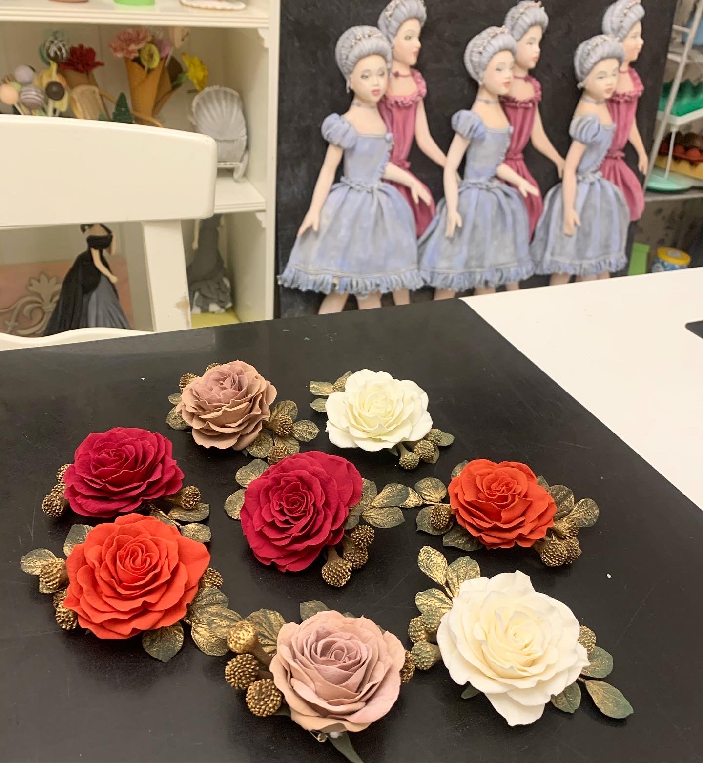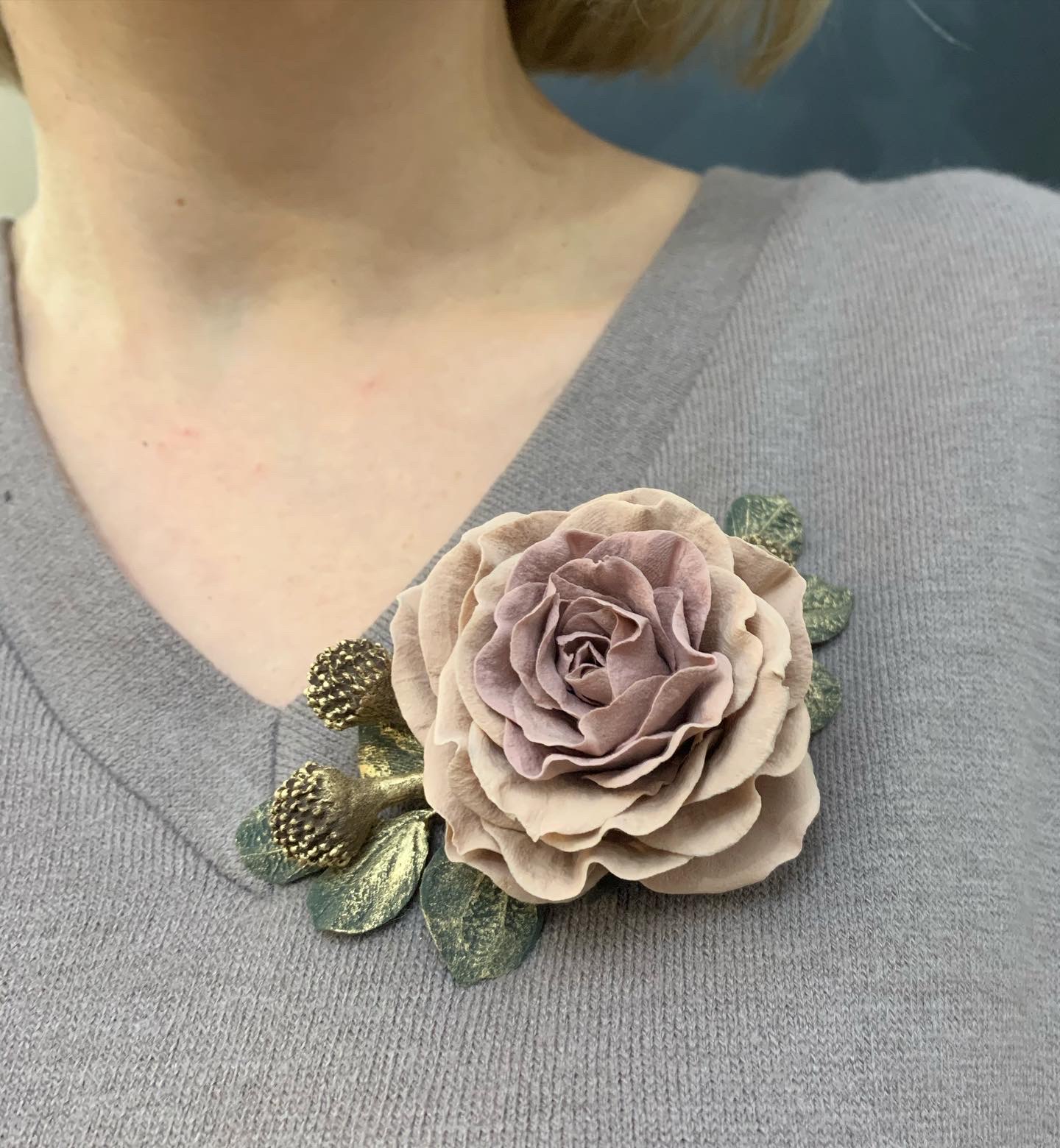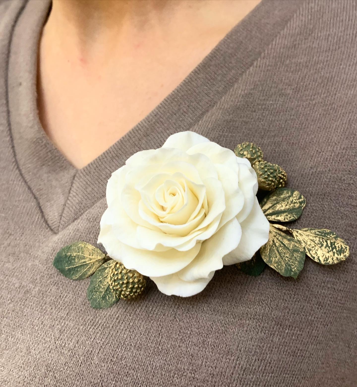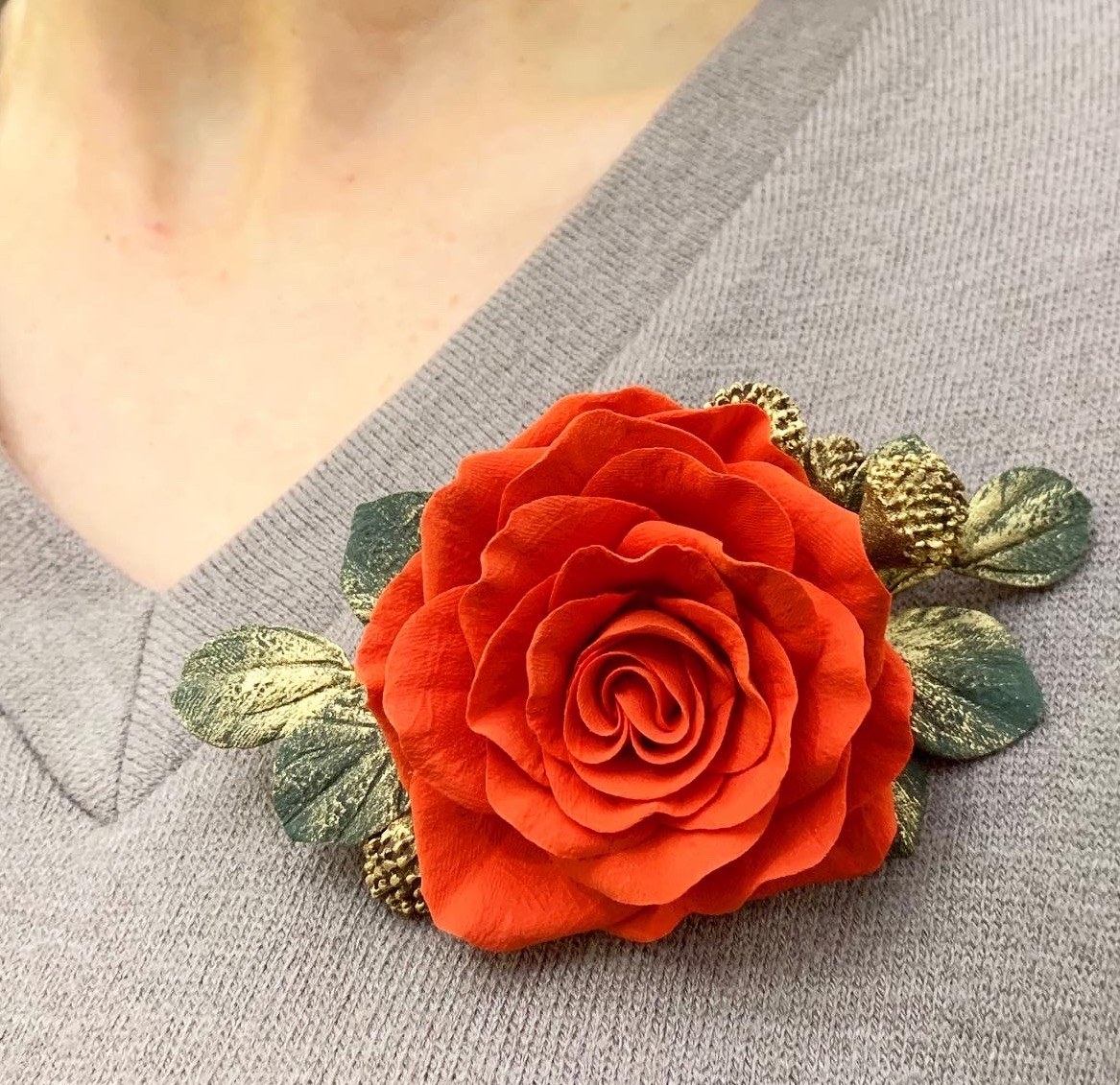Делаем на заказ. Такая брошь с розой, слепленной из японской полимерной глины, станет прекрасным подарком для ваших любимых.  Брошь украшена листиками, которые можно позолотить.