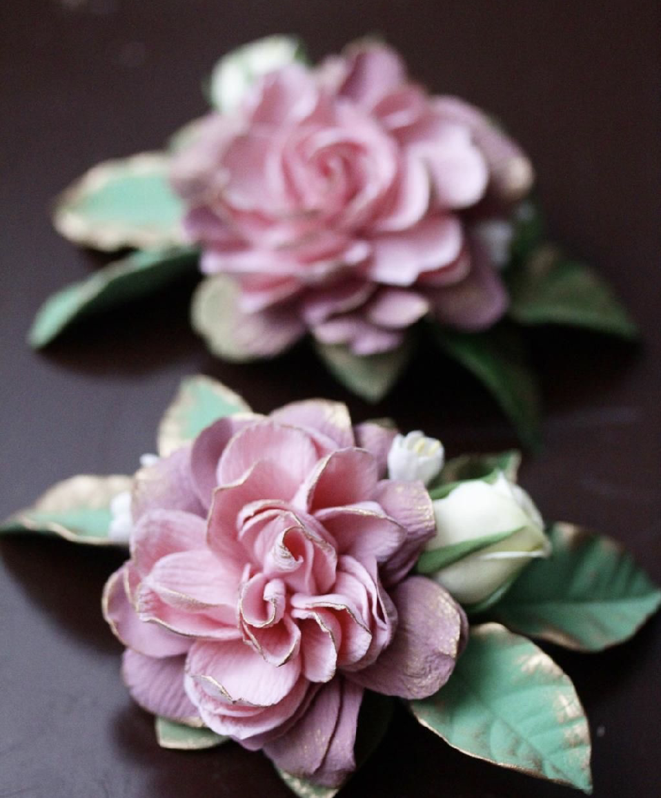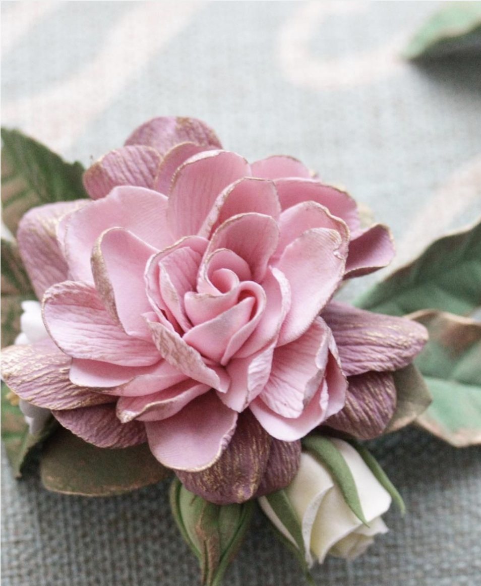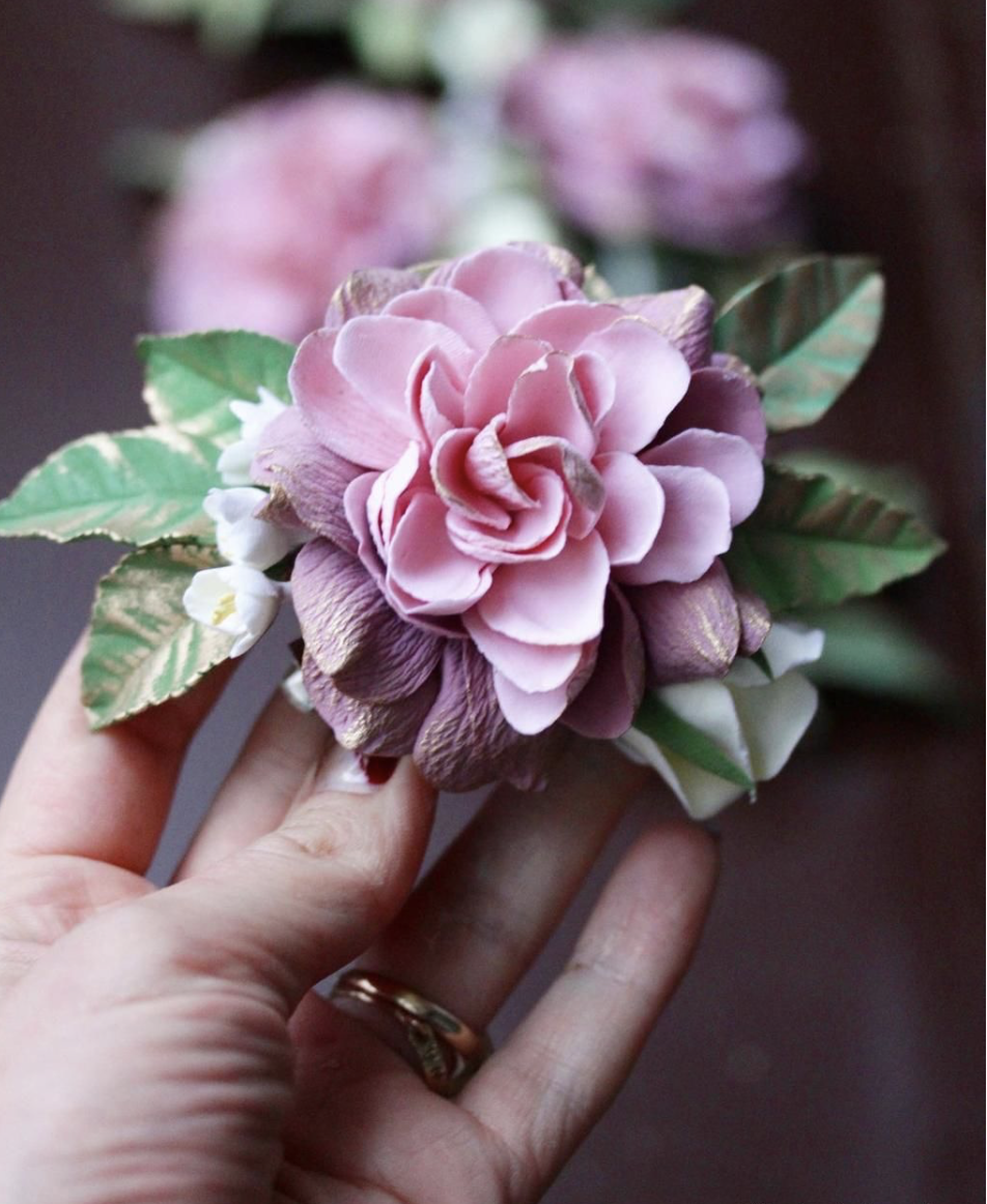 Брошь Розовая Гардения. Цветы и листья слеплены из японской полимерной глины DECO Clay. Возможны варианты крепления - брошь, зажим, заколка. Цвет для примера, возможны любые оттенки по Вашему желанию, заказ от 1 штуки или Комплектом для подружек невесты. Изделие легкое, продается в коробочке.