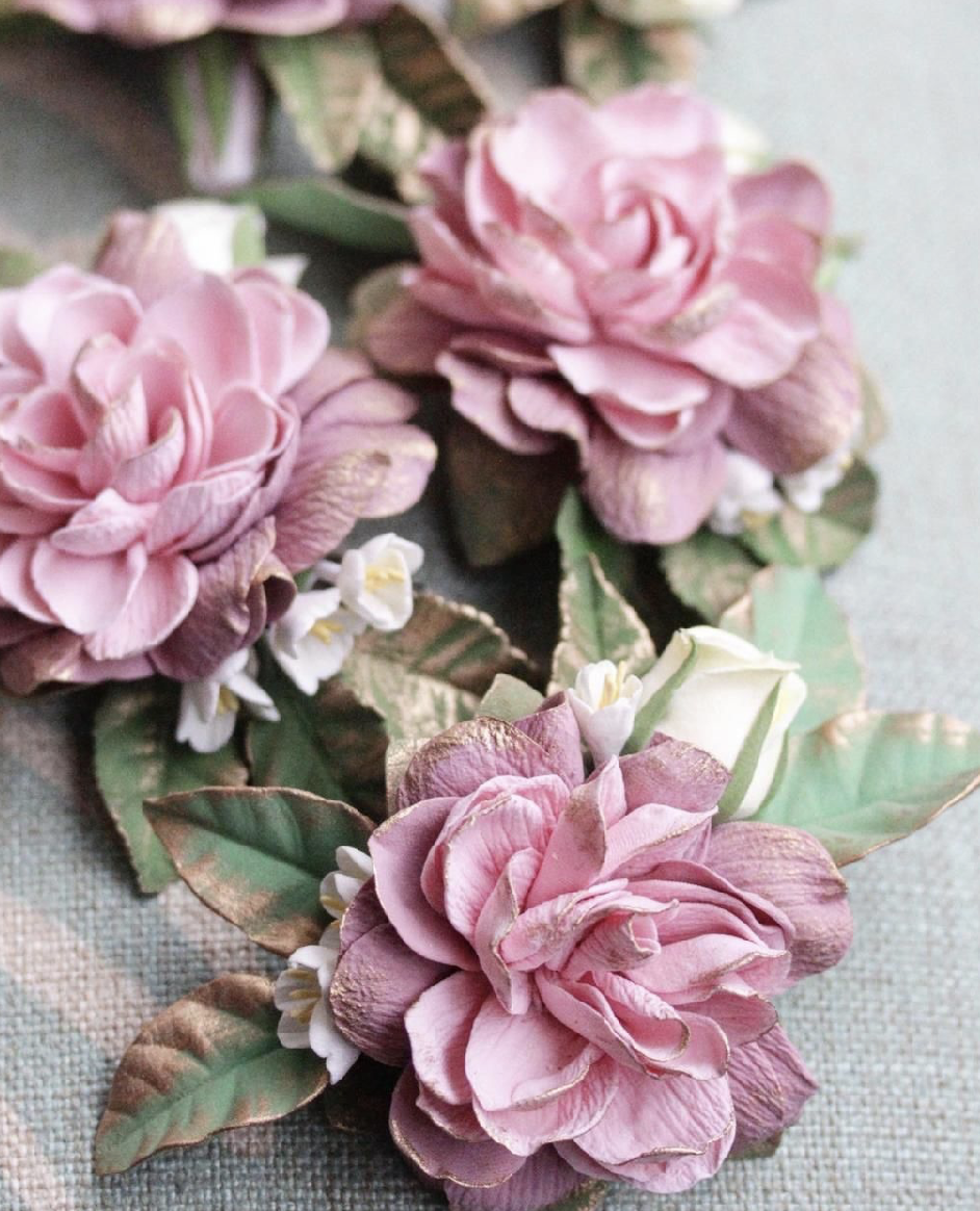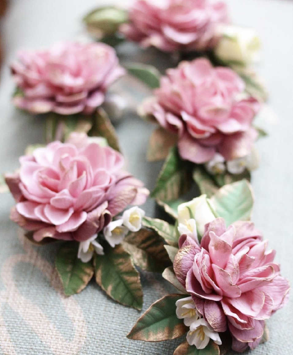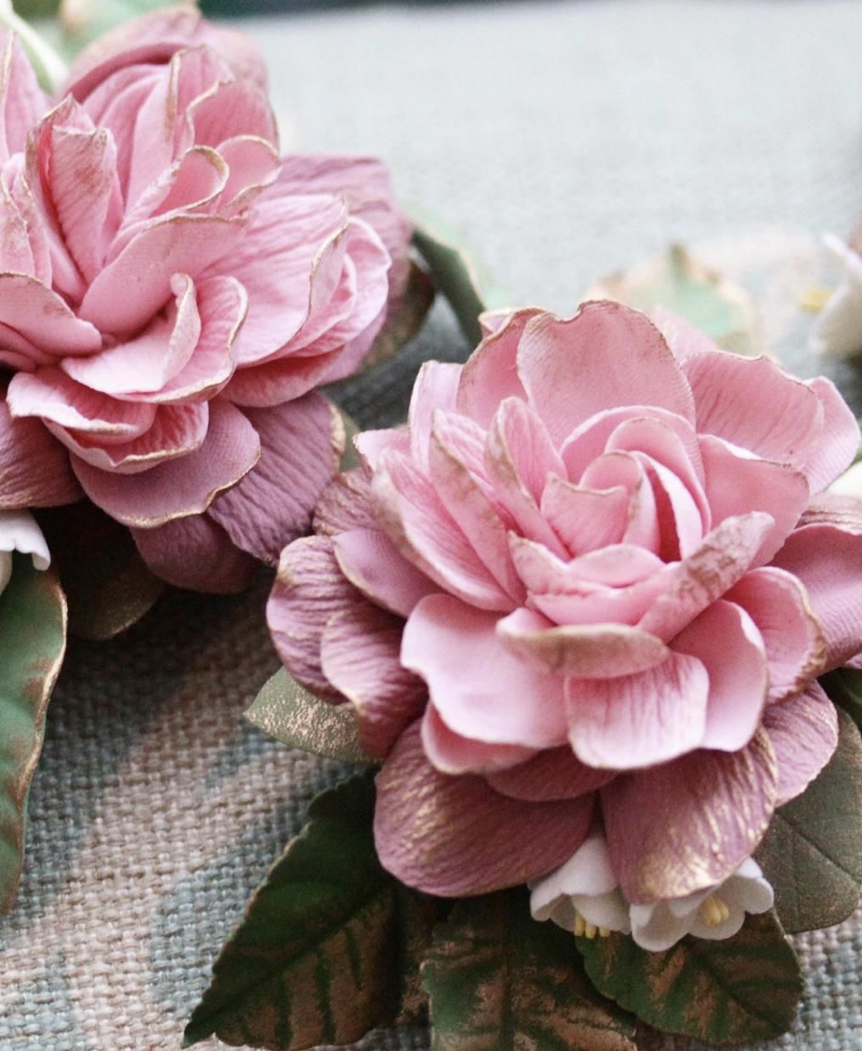 Брошь Розовая Гардения. Цветы и листья слеплены из японской полимерной глины DECO Clay. Возможны варианты крепления - брошь, зажим, заколка. Цвет для примера, возможны любые оттенки по Вашему желанию, заказ от 1 штуки или Комплектом для подружек невесты. Изделие легкое, продается в коробочке.