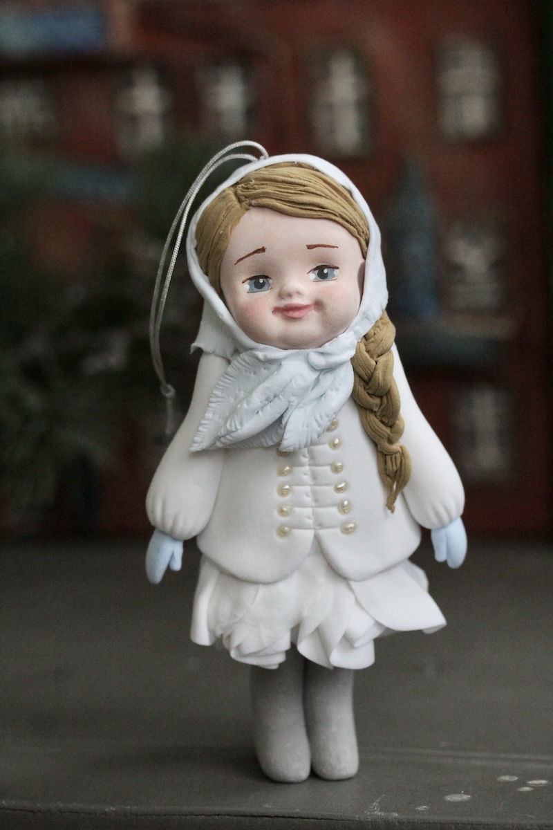 Елочная игрушка Девочка-пупсик в белом пальто с жемчужинками