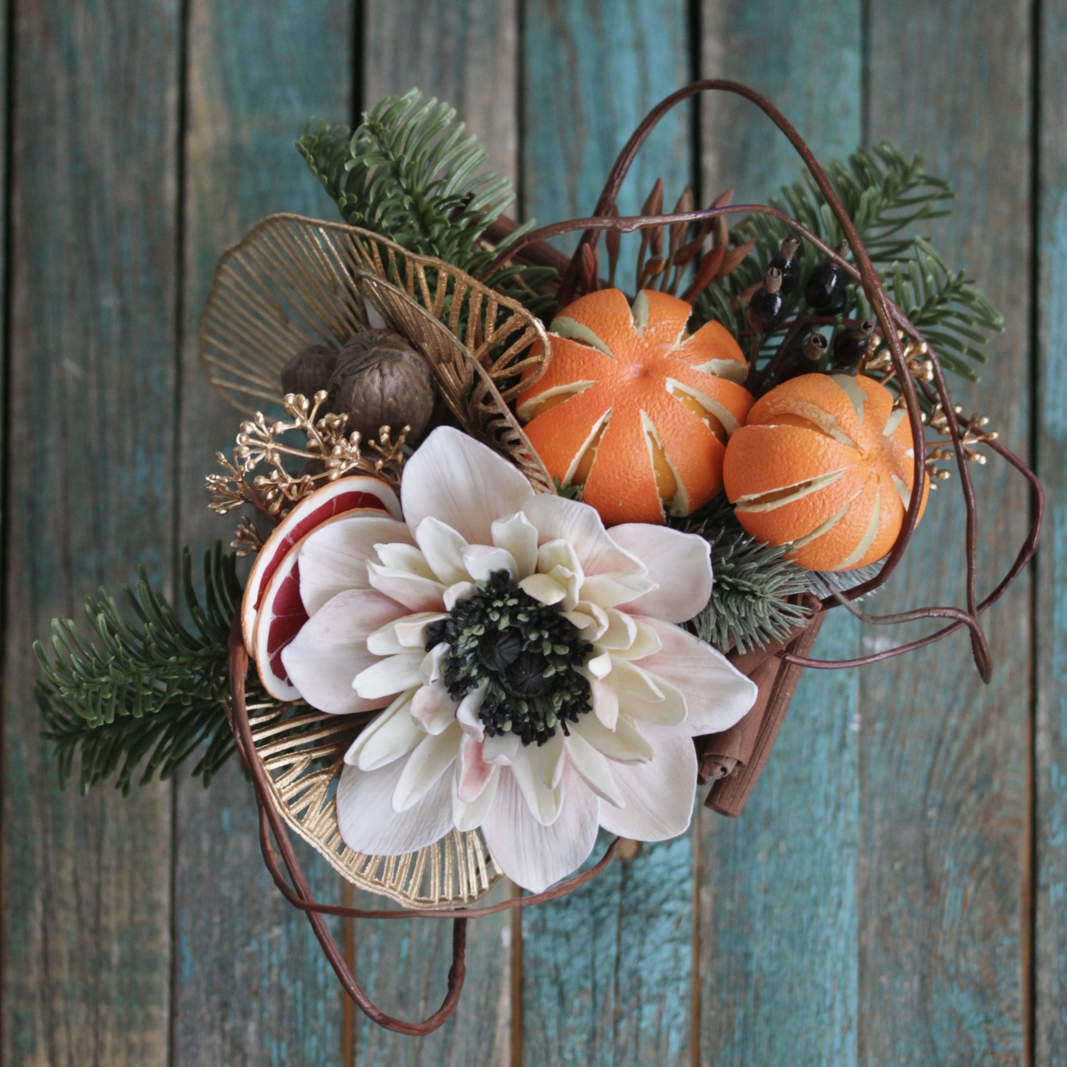 Изящная композиция в валеночке, который тоже слеплен из японской полимерной глины Claycraft by DECO. сушеные мандаринки, целые и нарезанные слайсами, блестящие ягодки, палочки корицы, лоза. Всё кроме еловых веточек и золотистых вставок - выполнено вручную из глины.