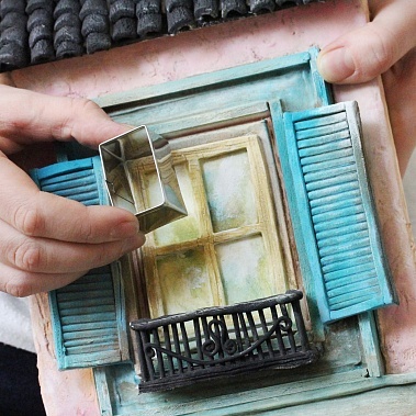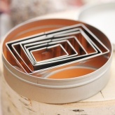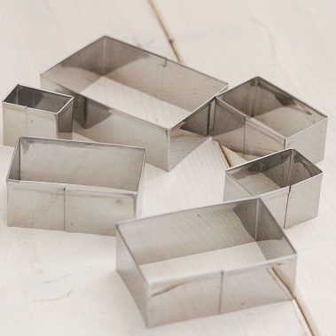 Набор из 6-ти жестяных каттеров - формочек, с помощью которых легко вырезать в раскатанной полимерной глине прямоугольные отверстия. Продаются в металлической баночке с крышкой.
