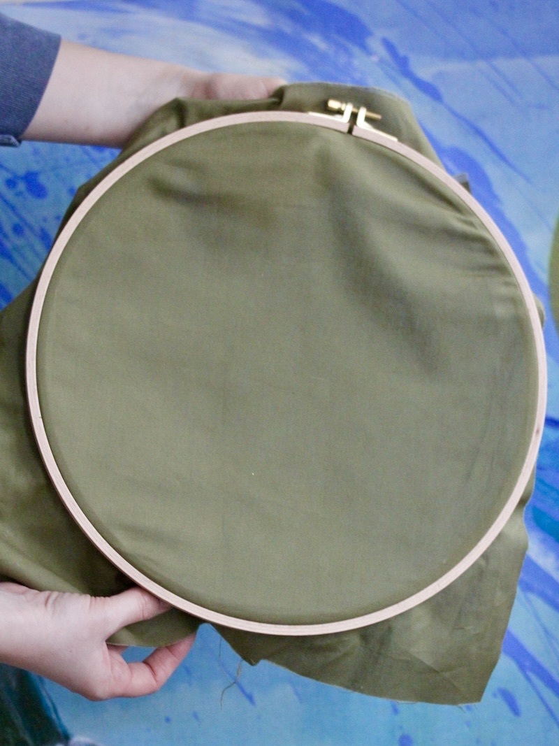 Пяльцы-рамка круглые большие деревянные с отрезом ткани.