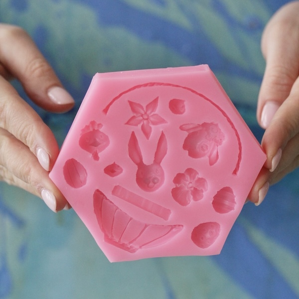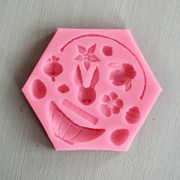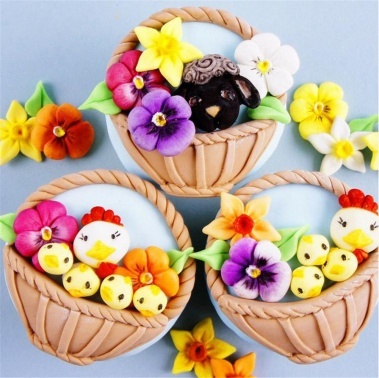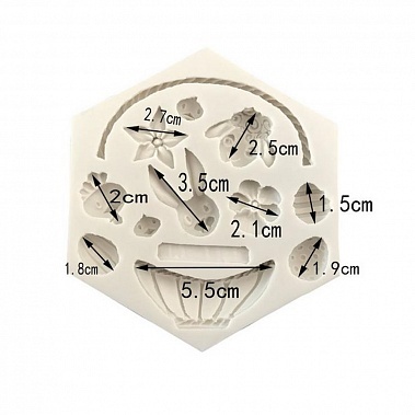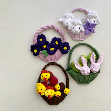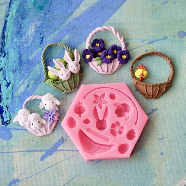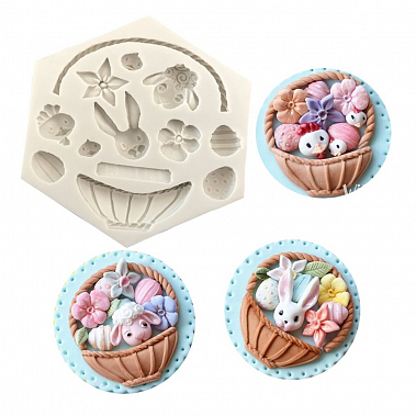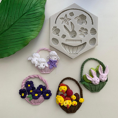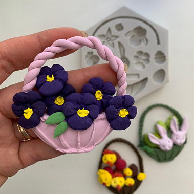 Силиконовый молд Пасхальная корзинка. Для изготовления из глины или другого материала веселой пасхальной поделки или открытки. Корзинка, барашек, курочка, цветочки, пасхальные яички. Пищевой силикон. Размер деталей от 1,8 см до 5,5 см.
