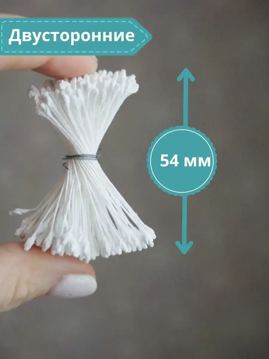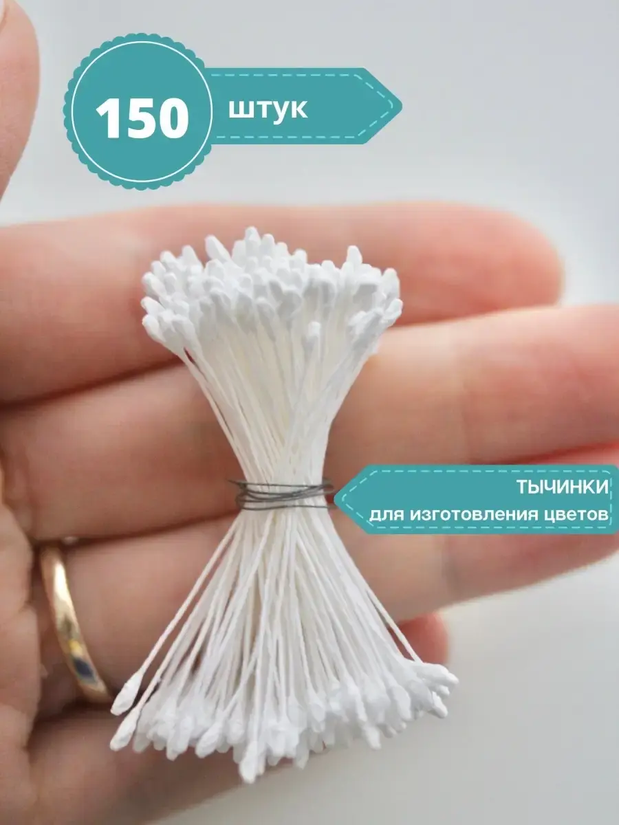 Тычинки белые для лепки декоративных цветов. В упаковке 150 нитей, из которых получится 300 тычинок. Тычинки практически незаменимый атрибут при создании качественных, профессиональных и высоко детализированных цветов из искусственных материалов (полимерная глина, скульптурный пластилин, фоамиран всех видов, фетр мягкий и жесткий, экокожа и кожзам, мастика. Форма тычинок заостренная, используются в лепке веточек эвкалипта, в качесте семян. Вы всегда можете покрасить тычинки в любой цвет акриловыми красками. Нить держит форму даже при намокании. Тычинки не съедобны, это нужно учитывать при изготовлении цветов из мастики для тортов.