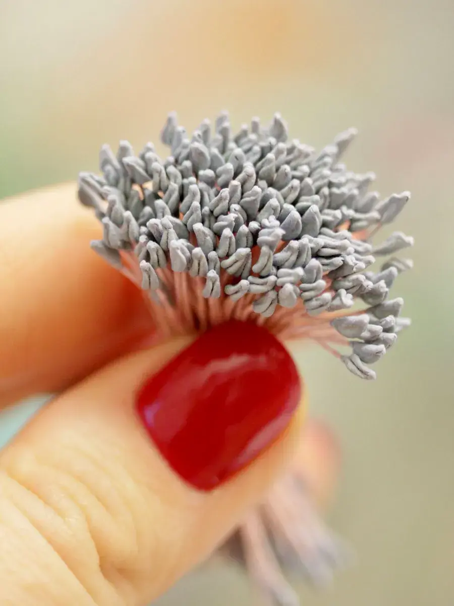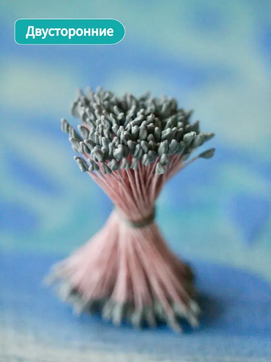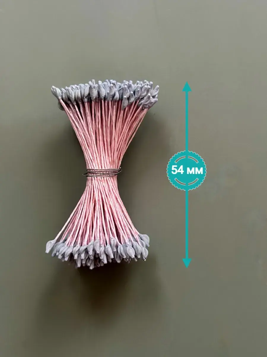 Тычинки серые с розовым основанием средние для лепки декоративных цветов. В упаковке 155 нитей, из которых получится 310 тычинок. Тычинки практически незаменимый атрибут при создании качественных, профессиональных и высоко детализированных цветов из искусственных материалов: полимерная глина, скульптурный пластилин, фоамиран всех видов, фетр мягкий и жесткий, экокожа и кожзам, мастика. Вы всегда можете покрасить тычинки в любой цвет акриловыми красками. Нить держит форму даже при намокании. Тычинки не съедобны, это нужно учитывать при изготовлении цветов из мастики для тортов. Сделано в Японии, не токсичны и безопасны.