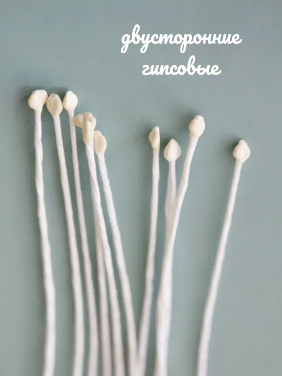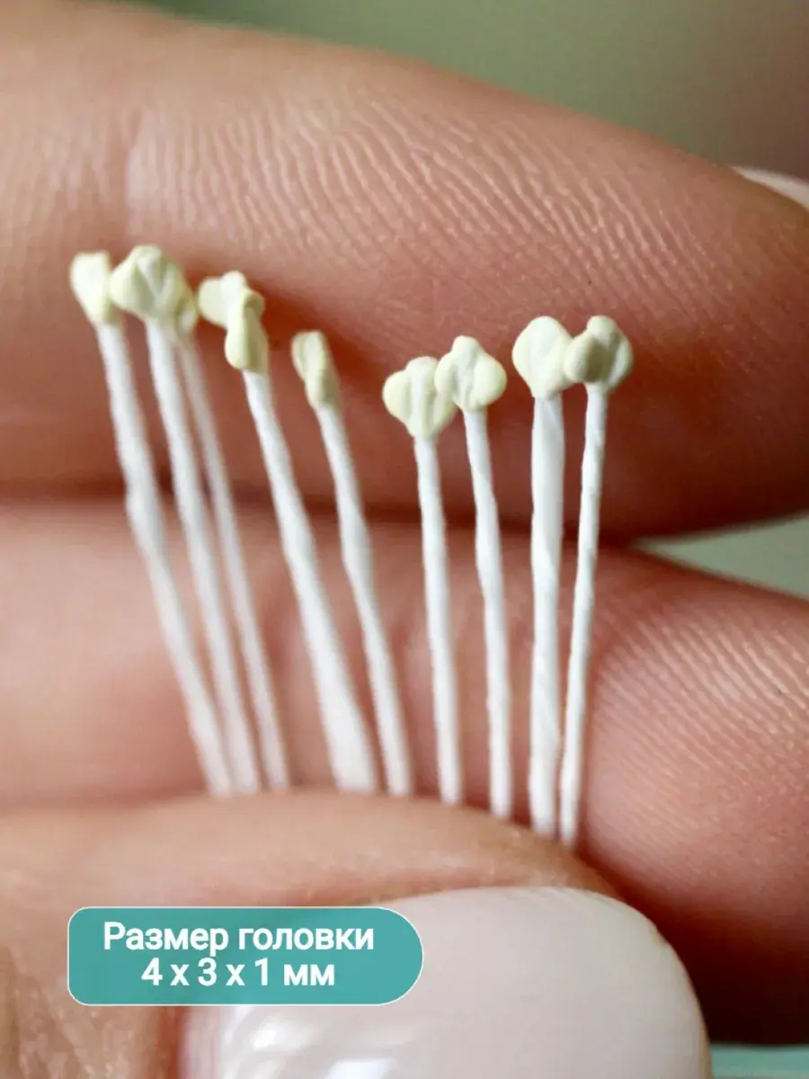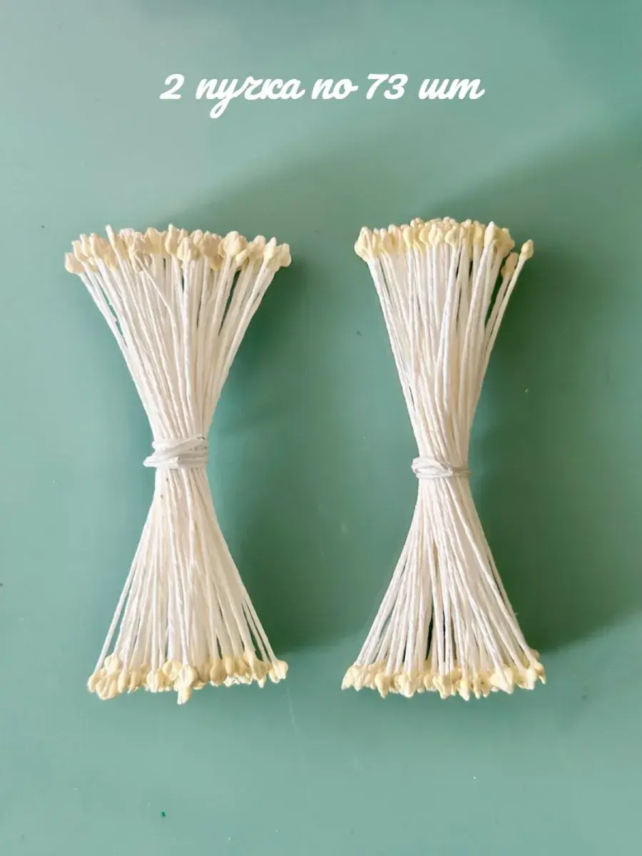 Тычинки белые крупного размера для лепки декоративных цветов. В упаковке 2 пучка по 73 нити, из которых получится 292 тычинки. Тычинки практически незаменимый атрибут при создании качественных, профессиональных и высоко детализированных цветов из искусственных материалов: полимерная глина, скульптурный пластилин, фоамиран всех видов, фетр мягкий и жесткий, экокожа и кожзам, мастика. Вы всегда можете покрасить тычинки в любой цвет акриловыми красками. Нить держит форму даже при намокании. Тычинки не съедобны, это нужно учитывать при изготовлении цветов из мастики для тортов.